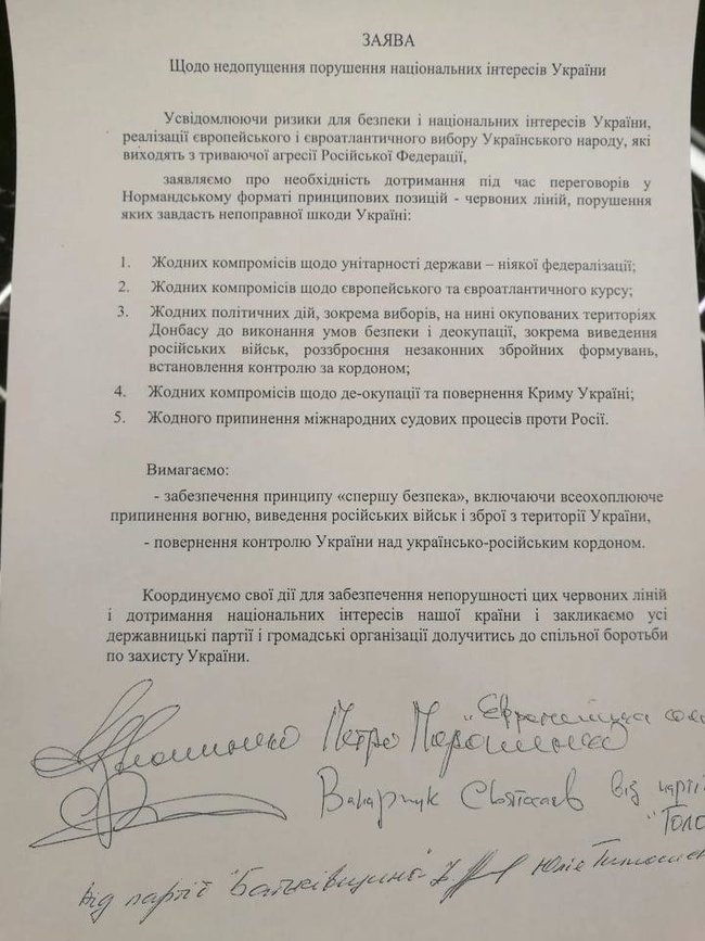 Депутати від фракцій "Батьківщина", "Голос" і "Європейська Солідарність" зробили спільну заяву по "нормандському саміту", який відбудеться в Парижі 9 грудня.