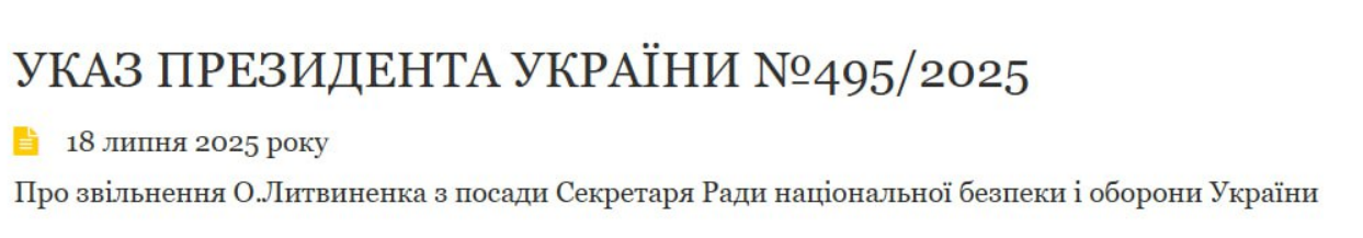 Указ №495/2025 звільняє Олександра Литвиненка з посади секретаря Ради національної безпеки і оборони України.