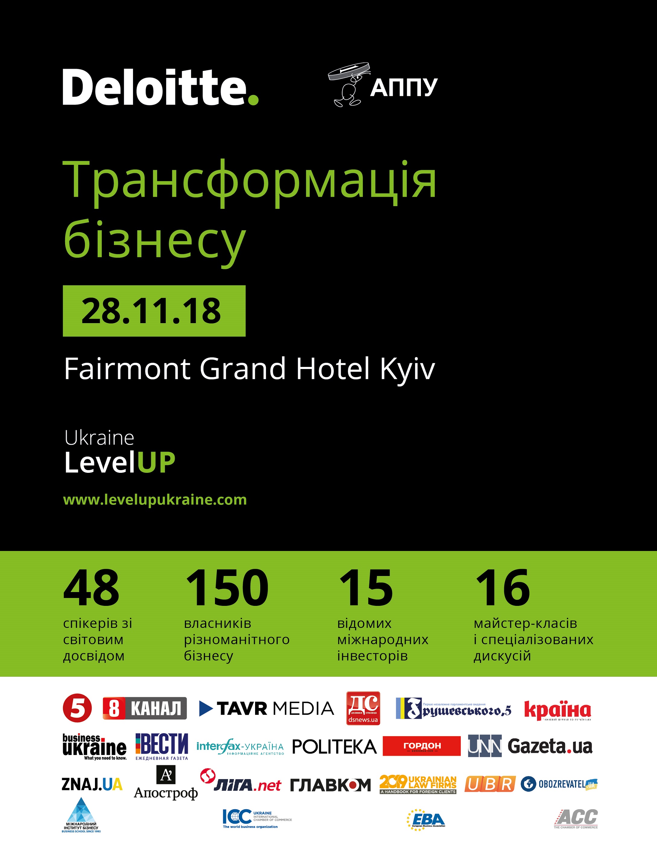 28 листопада 2018 року о 9:00 годині у готелі "FairmontGrandHotelKyiv" компанія "Делойт" в Україні в партнерстві з Асоціацією платників податків України організовують масштабний бізнес-форум "LЕVEL UP UKRAINE 2018".
