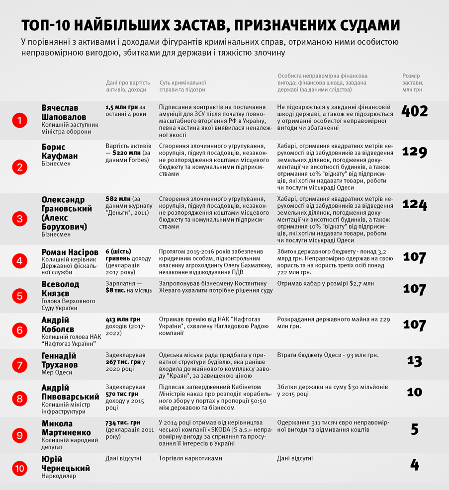 Бывший заместитель министра обороны Вячеслав Шаповалов по размеру назначенного ему залога недавно занимал второе место после Насирова, а когда тому снизили залог до 107 млн грн, оказался на первом месте с 402 миллионами гривен. И объяснений этому тоже не было.