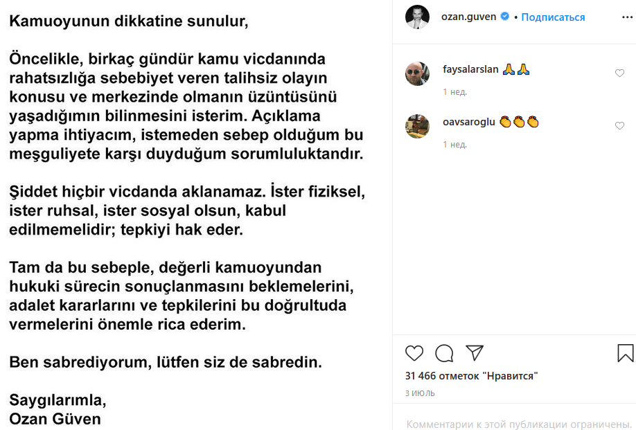 Гювен также решил объясниться и перед поклонниками, которые не ждали от него такой жестокости. Актер написал в Instagram пост, в котором признает, что насилие не может быть оправдано. Он просит не делать скоропалительных выводов и дождаться окончания судебного процесса. "Я терпеливый, пожалуйста, будьте терпеливы тоже", - написал актер.