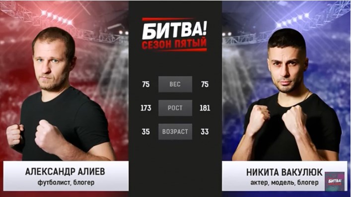 В рамках проекта "Битва" проходил боксерский поединок между бывшим футболистом киевского "Динамо" и сборной Украины Александром Алиевым и известным актером Никитой Вакулюком.