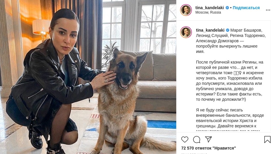 "Марат Башаров, Леонид Слуцкий, Регина Тодоренко, Александр Домогаров - попробуйте вычеркнуть лишнее имя, - написала Канделаки, намекая на обвинения перечисленных персон в насилии по отношению к женщинам. - После публичной казни Регины я искренне хочу знать, кого Тодоренко избила до полусмерти, изнасиловала или публично унижала, доводя до истерики? Все в этом списке, за исключением Регины, сохранили работу, положение, да и уважаемы частью аудитории. Вы не видите абсурда в этой картине?"