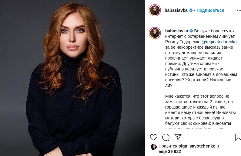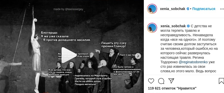 "Регина Тодоренко уже сто раз извинилась за свои слова, но этого мало. Ведь вопрос не в словах, не правда ли? А в том,что нет большего удовольствия для толпы, чем уничтожить очередную знаменитость, - считает российская телеведущая. - Я против домашнего насилия, против виктимшейминга и рассуждений в духе "она сама виновата", но я также против "диктатуры толерантности". Когда любое неосторожное или глупое слово становится стартом травли. Все либеральные,феминистские, лгбтшные и прочие ценности ценны до тех пор, пока мы просвещаем, возмущаемся, отстаиваем их, но даем всем право на ошибку и право на извинение. Если права такого нет, то грош цена этим ценностям".
