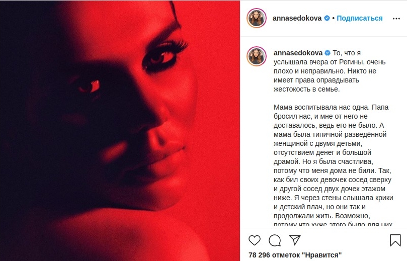 "То, что я услышала вчера от Регины, очень плохо и неправильно. Никто не имеет права оправдывать жестокость в семье, - написала Седокова в Instagram. - Мама воспитывала нас одна. Папа бросил нас, и мне от него не доставалось, ведь его не было. А мама была типичной разведенной женщиной с двумя детьми, отсутствием денег и большой драмой. Но я была счастлива, потому что меня дома не били. Так, как бил своих девочек сосед сверху и другой сосед двух дочек этажом ниже. Я через стены слышала крики и детский плач, но они так и продолжали жить. Возможно, потому что хуже этого было для них одно – стать моей мамой. Остаться без мужика. Остаться одной".