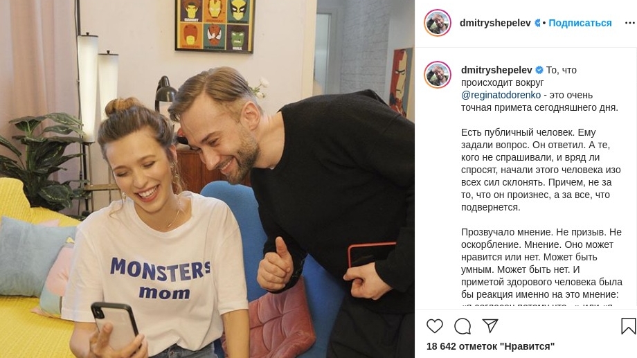 "Есть публичный человек. Ему задали вопрос. Он ответил. А те, кого не спрашивали, и вряд ли спросят, начали этого человека изо всех сил склонять, - заступился за Регину Тодоренко телеведущий и гражданский муж покойной Жанны Фриске. - Прозвучало мнение. Не призыв. Не оскорбление. Мнение. Оно может нравится или нет. Может быть умным. Может быть нет. На мой взгляд, это очень печальный симптом – именно вынуждать приносить извинения. Ну как так? Это диагноз".