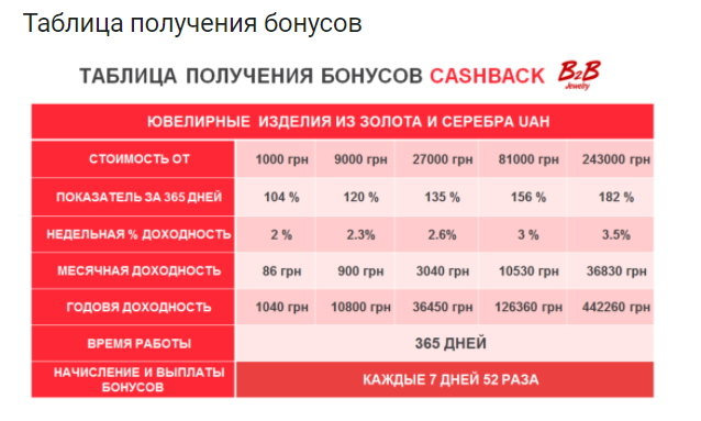 Также на сайте есть таблица получения бонусов. Здесь тоже логика простая и привычная для пирамид – чем более дорогую покупку ты совершил, тем больший бонус получишь. Максимум – 182% для тех, кто накупит "ювелирки" на сумму 243 тысяч гривен.