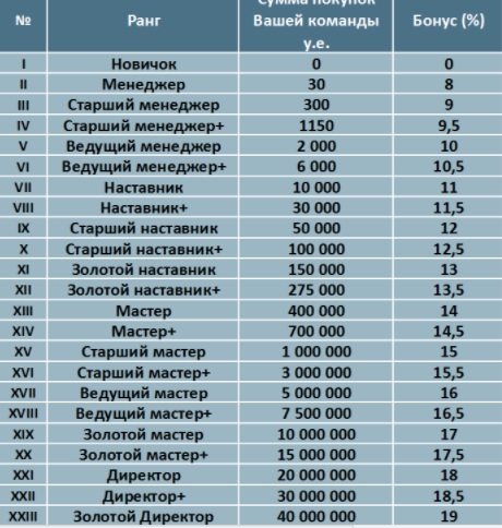 Способ "роста" тоже не нов. Для этого участнику нужно было постоянно привлекать новых клиентов. Сумма их покупок в системе создавала оборот. От величины этого оборота зависел переход на новый уровень. Высшая планка – 40 млн долларов.