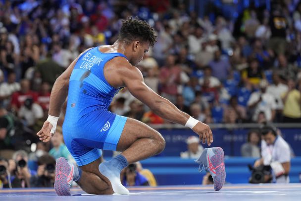 Затем Беленюк демонстративно снял борцовки и поставил их в центр ковра. Этот символический жест в борьбе означает, что спортсмен завершил карьеру.