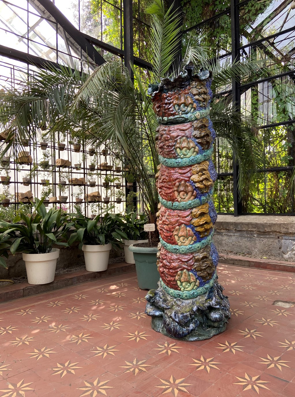 Есть целый ряд работ, которые обращают внимание на красоту природы - ведь на территории комплекса великолепный парк и яблоневый сад. Это и графика Анатолия Белова, посвященная магии зеленых насаждений этого пространства, и две колонны Ксении Гнилицкой - скульптурная группа странного сочетания форм и цветов, призванная украсить оранжерею, которая вот-вот откроется.