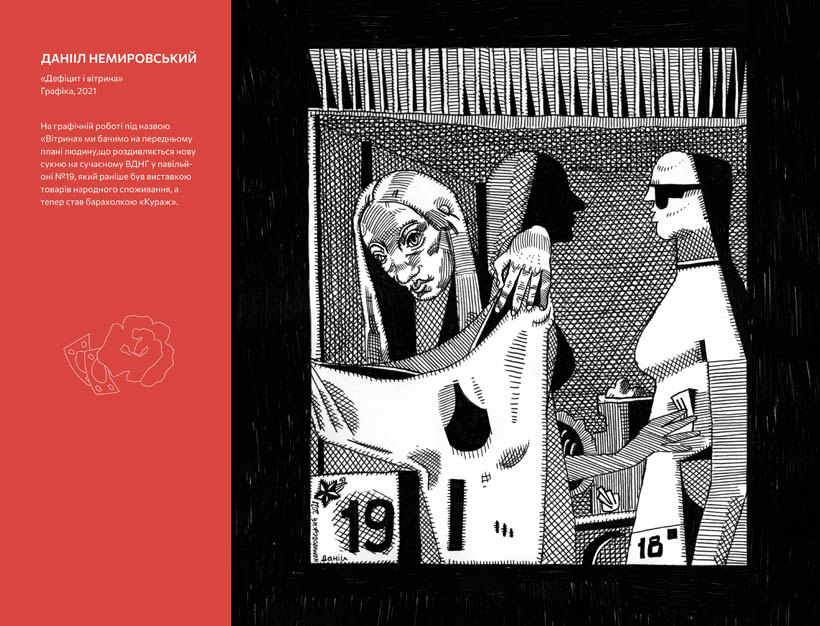 Ряд работ, посвященных истории комплекса, неразрывно связана с болью советских людей. Например, с тематикой отдельных павильонов. А именно 19-го, где раньше проходила выставка товаров народного потребления. Эту тему поднимают графические работы "Дефицит и витрина" Даниила Немировского.
