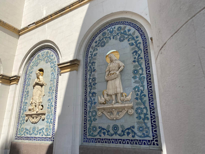 "Эта серия работ называется "Реканонизация", - рассказывает Евгения Моляр. - Жанна начала ее в 2017 году: однажды, приехав из Италии, прогуливалась по ВДНХ и заметила, как эти барельефы колхозника и колхозницы напоминают католические скульптуры. Им не хватает только над головой нимбов".