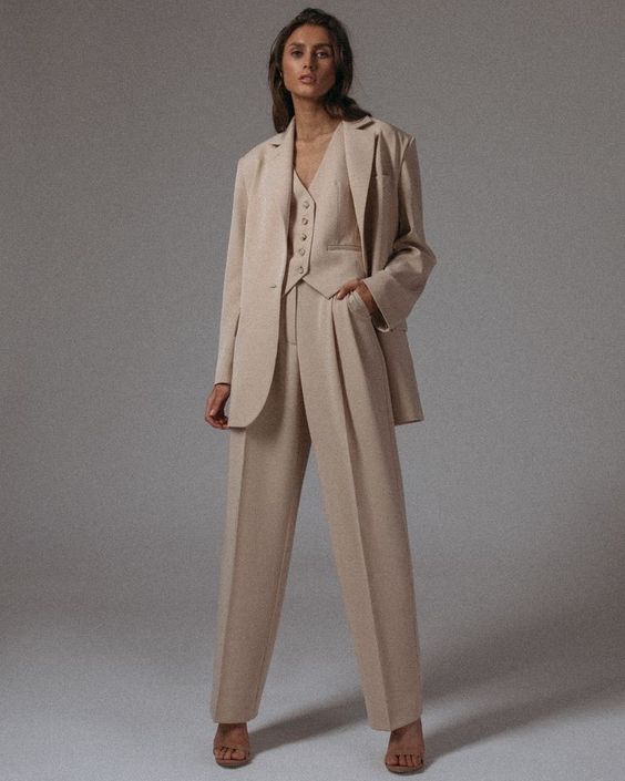 На осень также можно присмотреть стильный костюм-тройку бежевого оттенка, который состоит из брюк, жилета и пиджака.