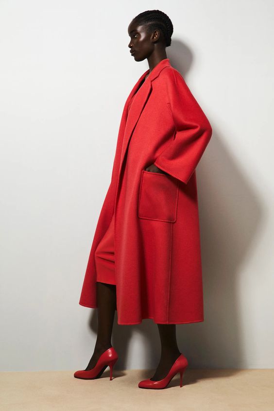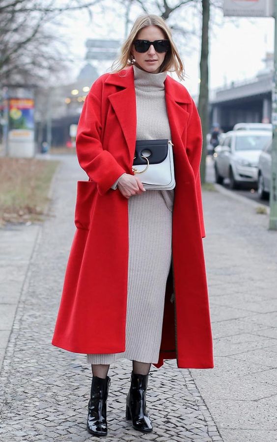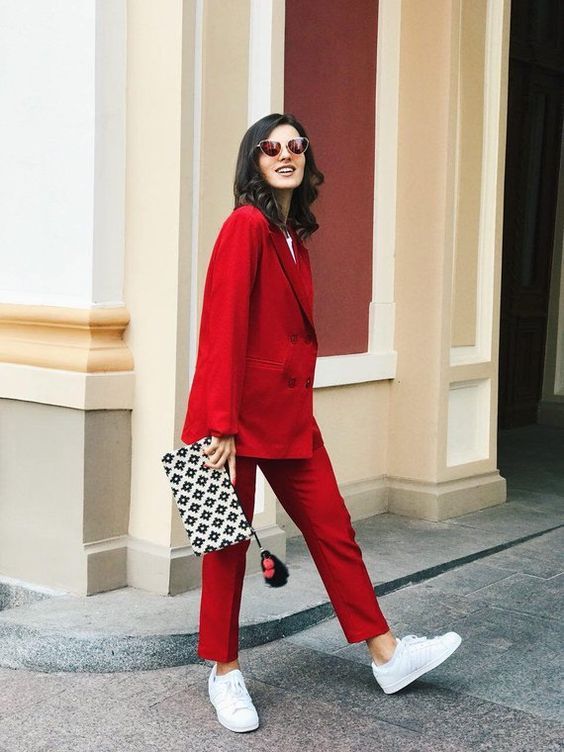 На осень можно присмотреть брючный костюм алого оттенка, теплое пальто или массивный пиджак, обувь или аксессуары.