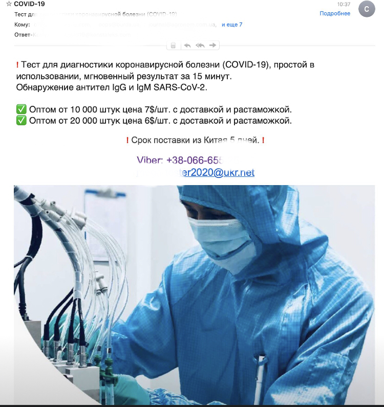 Вместе с тем в социальных сетях регулярно появляются посты с предложением купить тест-системы для определения заболевания на ранних сроках. Например, вот такой спам массово приходит на почту.