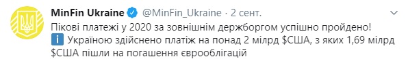 В начале сентября Министерство финансов сообщило, что Украина осуществила платеж на более, чем 2 миллиарда долларов в рамках погашения внешнего долга.