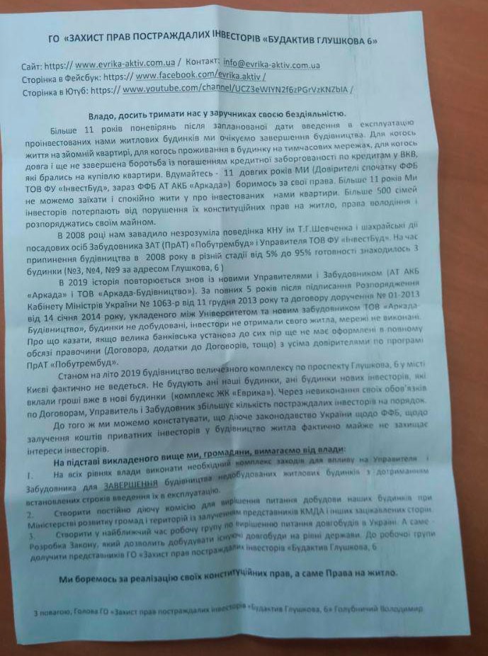 "По состоянию на лето 2019 года строительство огромного комплекса по проспекту Глушкова, 6 в Киеве фактически не ведется… Власть, хватит держать нас в заложниках своей бездеятельностью. Более 11 лет скитаний после запланированной даты введения в эксплуатацию проинвестированных нами жилых домов мы ожидаем завершения строительства… Более 500 семей инвесторов страдают от нарушения их конституционных прав на жилье, права владеть и распоряжаться собственным имуществом", - говорится в обращении инвесторам к представителям власти.