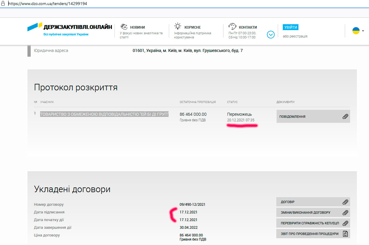Характерно, что в случае с ООО "Ей Бі Ді Груп" согласно сайту "Держзакупівлі.онлайн", датой проведения закупки указано 20 декабря, а датой подписания договора… 17 декабря. Интересно было бы спросить руководителей ГП "Медицинские закупки Украины" - каким это образом они смогли определить победителя за три дня до проведения операции?