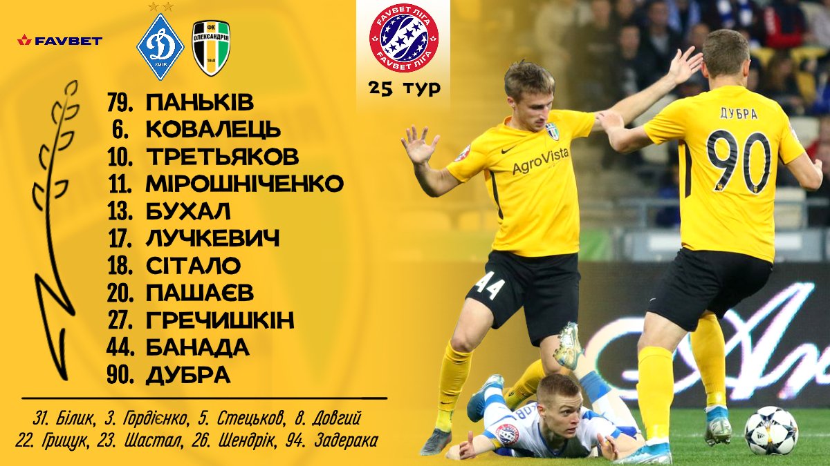 "Александрия": Панькив, Бухал, Мирошниченко, Дубра, Пашаев, Гречишкин, Лучкевич (Задерака, 68), Банада (Гордиенко, 59), Третьяков (Шастал, 80), Ковалец (Грицук, 68), Ситало (Безбородько, 68).