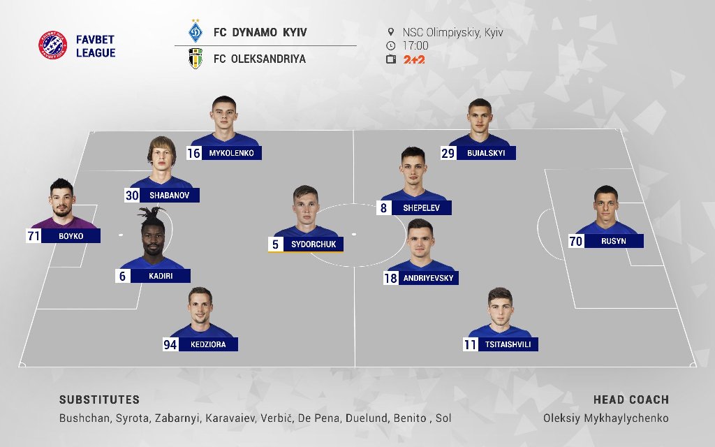 "Динамо": Бойко, Шабанов, Миколенко, Кендзера, Мохаммед, Андриевский (де Пена, 62), Шепелев, Сидорчук, Буяльский, Цитаишвили (Караваев, 62), Русин (Фран Соль, 74).