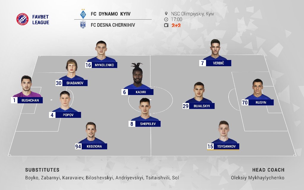 "Динамо": Бущан, Кендзера (Караваев, 46), Миколенко, Попов, Шабанов, Шепелев, Цыганков, Вербич, Мохаммед, Буяльский, Русин.