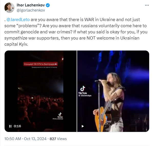 Американский певец и актер Джаред Лето на концерте в Сербии очень "тепло" пообщался с россиянами и пообещал приехать с концертами в Россию и Украину, "когда закончатся все эти проблемы". Так он назвал войну России против Украины и убийства мирных украинцев.