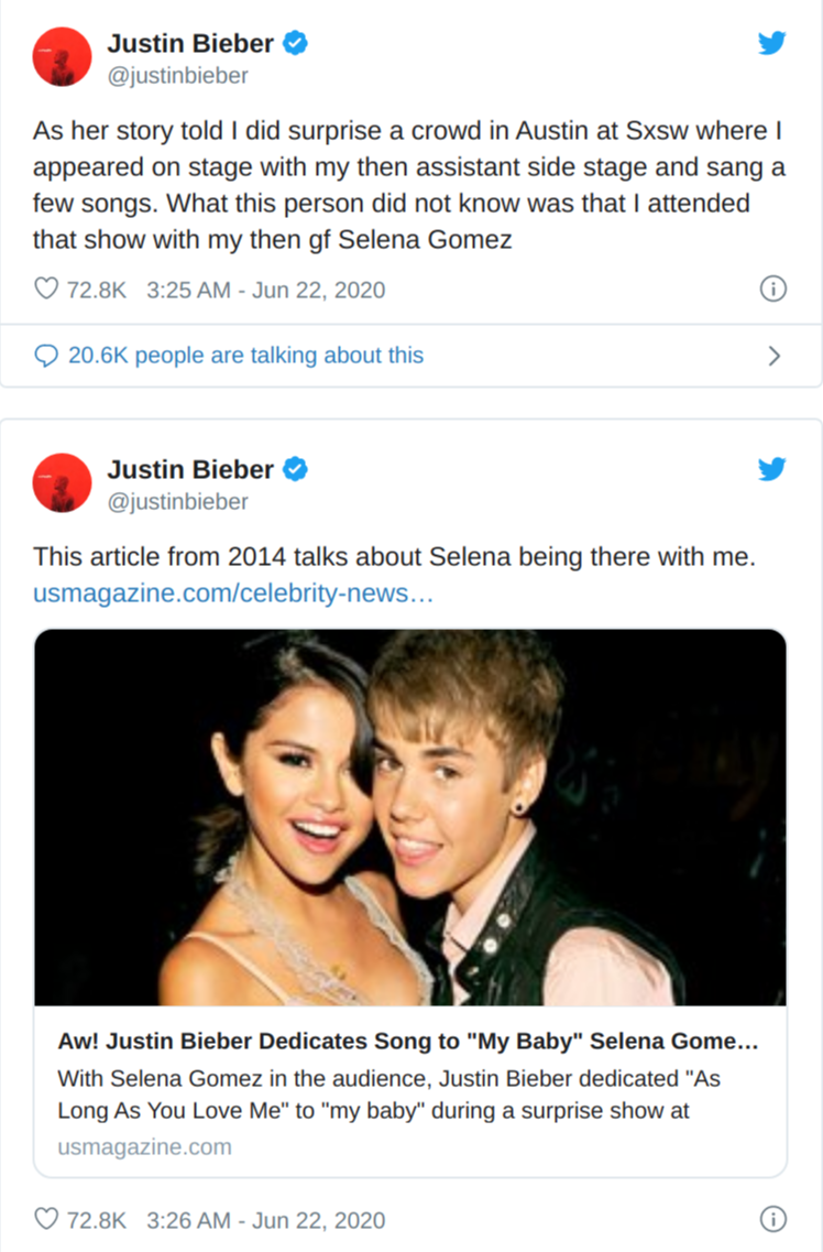 "Слухи есть слухи, но сексуальное насилие - это не то, что я могу легко спустить со счетов, - написал Бибер. - Появился новый Twitter, который рассказывает о моей причастности к сексуальному насилию 9 марта 2014 года в Остине, в отеле Four seasons. Я хочу объясниться. Это неправда. Согласно ее истории, я появился на сцене Sxsw со своим ассистентом, где спел несколько песен. Но этот человек не знает, что я присутствовал на шоу с моей тогдашней девушкой Селеной Гомес".