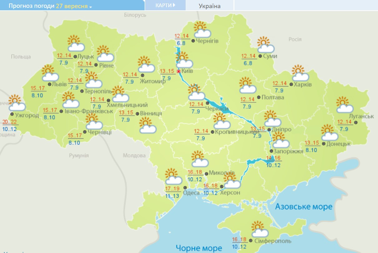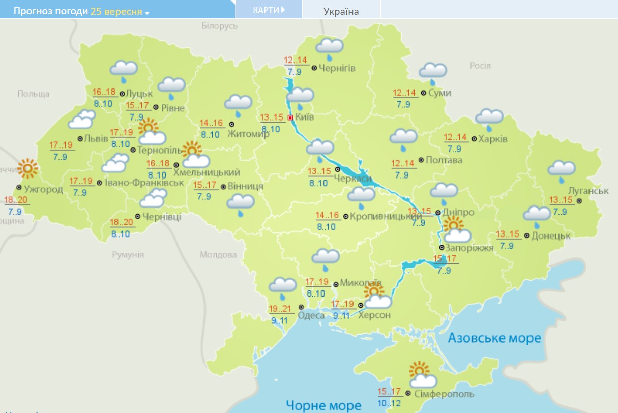По данным Укргидрометцентра, в субботу, 25 сентября, сухая погода без осадков ожидается только на западе и юго-востоке. На остальной территории синоптики прогнозируют кратковременные дожди.