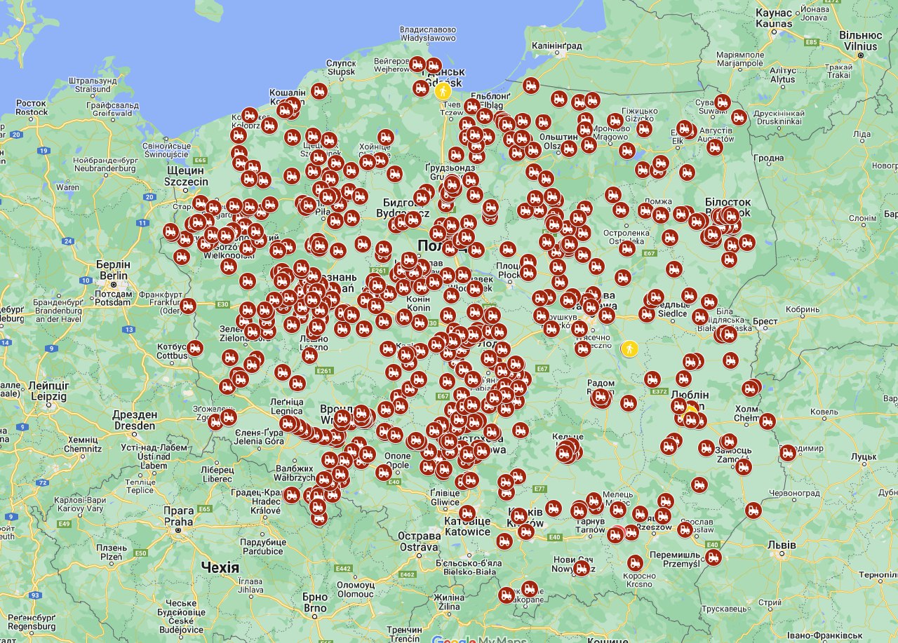 Мапа протесту польських фермерів 20 березня