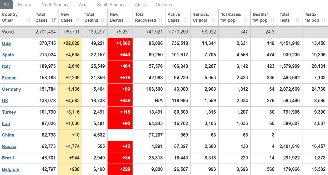 По состоянию на 23:00 в мире зафиксировано 2 701 484 случаев заражения. Умерли 189 297, выздоровели 741 921.
