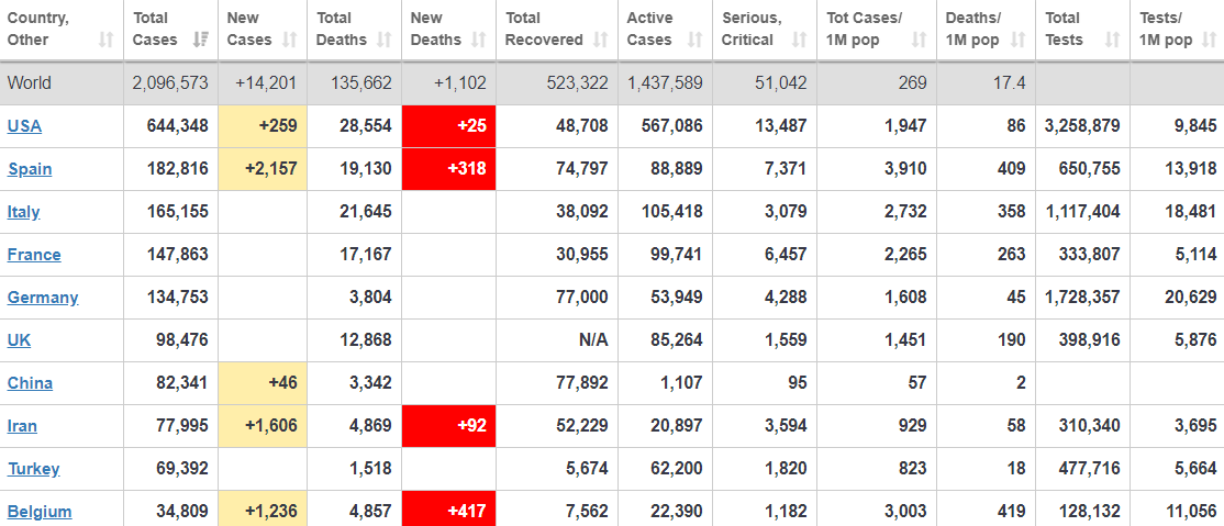 По состоянию на 23:30 в мире зафиксировано 2 127 873 случаев заражения. Умерли 141 454 человека.