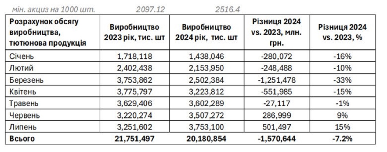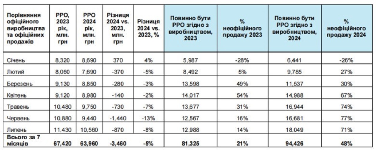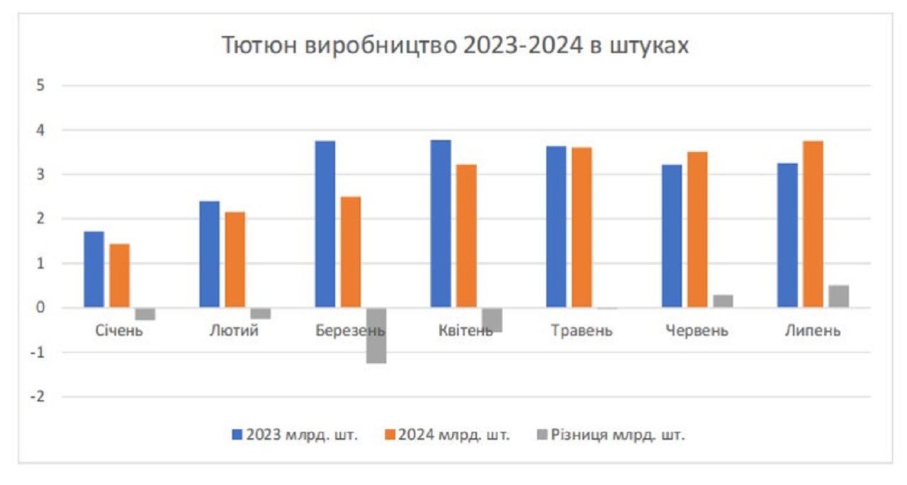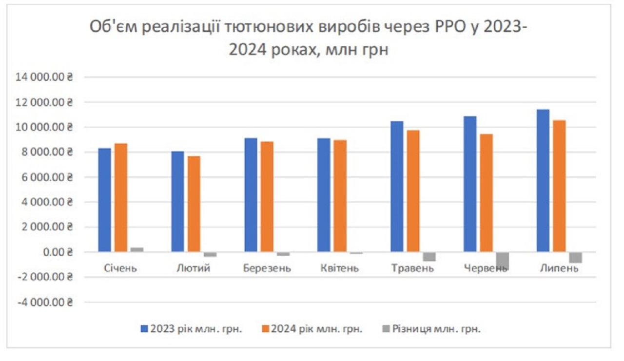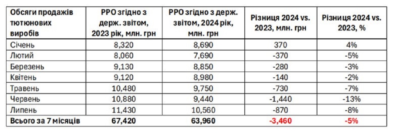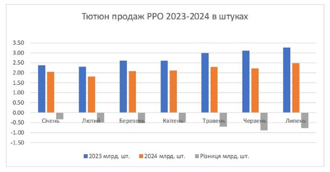 Видим, что в период январь – июль 2023 года официальный объем реализации табачной продукции в денежном эквиваленте был на 3,460 млрд. гривен больше, чем в 2024 году.