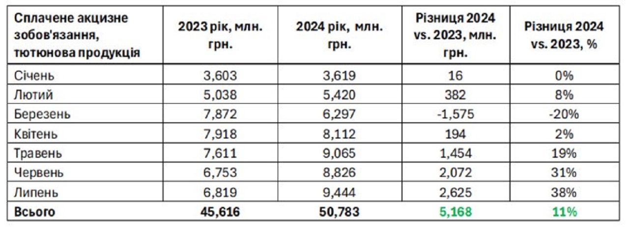 Государство за 7 месяцев 2024 года получило на 5,168 млрд. гривен больше акцизными платежами по сравнению с таким же периодом в 2023 году. Пока все логично, вырос акциз, выросли платежи.