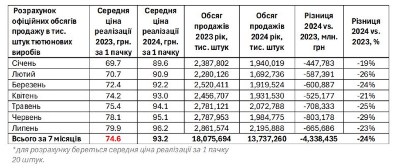 Условно, если средняя сигаретная пачка в 2023 году стоила курильщику 75 гривен, то за 7 месяцев 2024 года средняя цена уже составила 93 гривны.