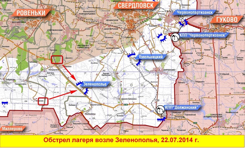 При этом основой обороны и главным узлом снабжения "изваринской" и "краснодонской" группировки был полевой лагерь Госпогранслужбы в районе Зеленополья. Созданный в конце июня, он, кроме всего, прочего перекрывал ростовскую трассу, по которой можно было осуществлять снабжение Красного Луча через пункт пропуска "Должанский".