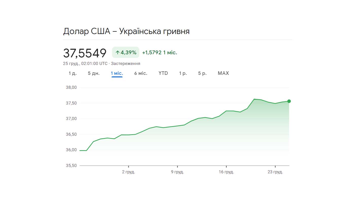 Если 24 ноября доллар на межбанке стоил 36,1 гривны, то через месяц он торгуется на уровне 37,5 гривны. То есть подорожание составило почти полторы гривны.