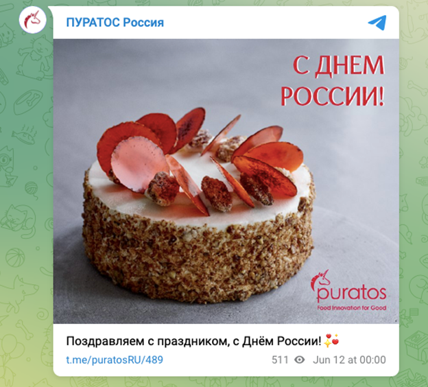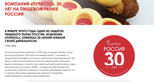 В январе текущего года "Пуратос-Россия" отпраздновала 30-летний юбилей своей деятельности на территории России. Компания заявила, что за свою 30-летнюю историю "стала одним из лидеров рынка пищевых ингредиентов для хлебопекарной и кондитерской промышленности, а также завоевала репутацию надежного партнера благодаря инновационным продуктам, ответственному подходу к ведению бизнеса, ориентации на клиента и построению взаимовыгодных отношений".
