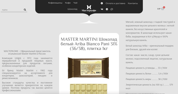 Скриншот с сайта Мастеркофе.рф, на котором продаются товары Master Martini - https://мастеркофе.рф/product/master-martini-шоколад-белый-31-bianco-pani-36-38-плитка-1кг/