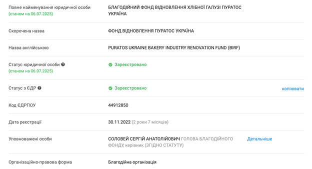 В декабре 2022 года "Пуратос Украина" создала Фонд восстановления хлебной отрасли Украины. На сайте указано, что он "основан для материальной и технологической поддержки украинских предприятий хлебобулочной и кондитерской отраслей, пострадавших в результате российской агрессии". А также что основной целью Фонда является восстановление поврежденных производственных линий и закупки сырья для производства. Руководитель фонда – директор ООО "Пуратос Украина" Сергей Соловей. Согласно данным платформы Opendatabot, он же – единственный там работник.