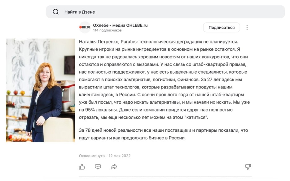 Многие международные компании пищевой промышленности, как финский Fazer, проявили свою четкую позицию и вышли с рынка россии несмотря на многомиллионные убытки. И хотя выход Puratos из россии не привел бы к гуманитарной катастрофе, пойти на такой шаг в компании почему-то не готовы.