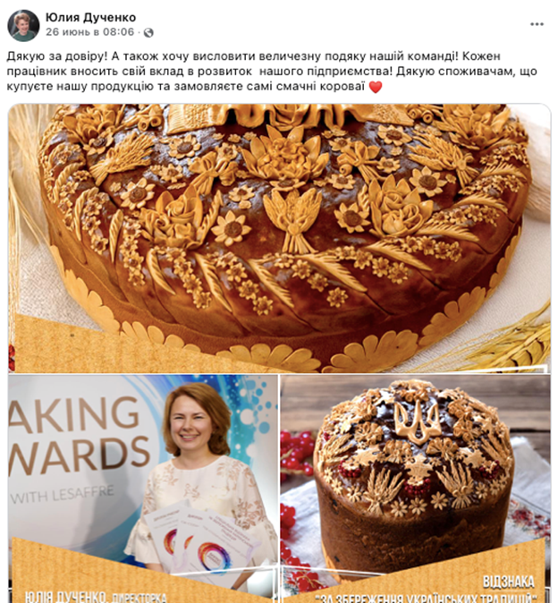 Юлия Дученко получила награды от Baking Awards with Lesaffre – скриншот с ее Facebook