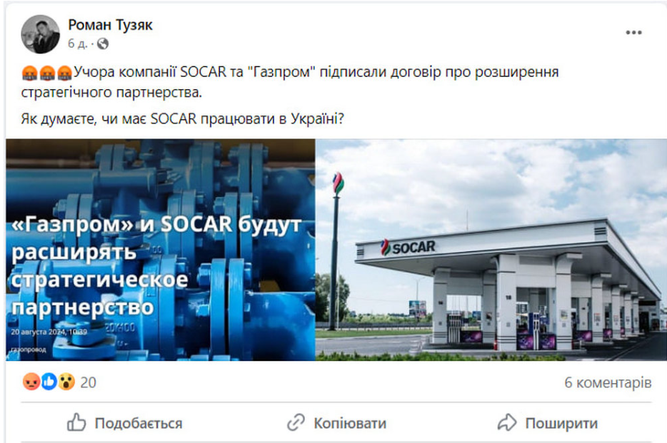 Только сообщение на сайте "газпрома" о развитии отношений с SOCAR (азербайджанцы, в отличие от россиян, не пиарились на этом визите, о котором, по сути, попросила украинская сторона) стало основой для финальной и мощной третьей волны негатива против азербайджанского бизнеса в Украине. Мы исследовали, что к обеду 20 августа в соцсетях так называемые лидеры мнений призвали обходить сеть АЗС SOCAR, при чем с текстом о бойкоте почти одновременно вышли несколько блогеров с большими охватами, то вечером и на следующий день были зафиксированы негативные и оскорбительные сообщения, в том числе о возможном "поджоге заправок SOCAR".