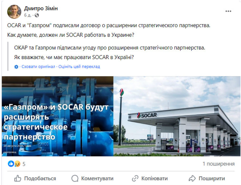 Вторая волна хейта компании пришлась в период проведения следующего тендера УЗ, особенно накануне обнародования результатов в период 16-19 августа. Если в пятницу в ФБ появлялась реклама малоизвестных СМИ, где подогревались тезисы о "венгерском горючем из российской нефти" от СОКАРа, то в понедельник 19 августа, когда стало известно о визите путина в Баку, о нефти все забыли и переключились на "путин-газпром-СОКАР".