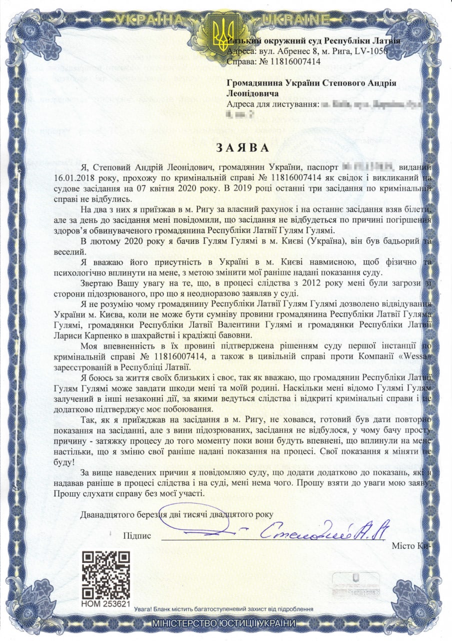 Согласно решению суда Гулами невыездной. Он не может покидать Латвию. Однако за время судебного разбирательства он неоднократно приезжал в Украину, в том числе с целью физического и психологического влияния, чтобы я изменил свои показания. В суде есть мое соответствующее заявление и официальная информация от Пограничной службы Украины: лишь в 2019-2020 гг. Гулами в общей сложности 22 раза пересекал государственную границу Украины. Очень интересно, как на этот документ отреагируют в Латвии…