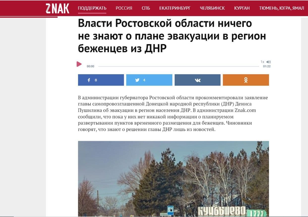 Более того, по сообщениям российских СМИ, нет информации об эвакуации и в администрации губернатора Ростовской области. А ведь именно эта приграничная область, по заверениям Пушилина и Пасечника, должна принять беженцев.