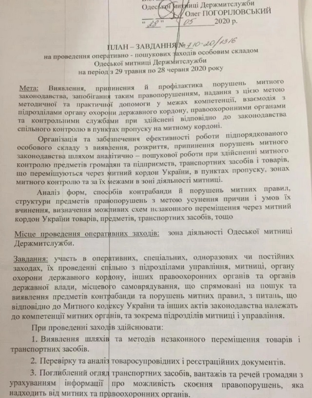 Спустя две недели после назначения Погориловский ринулся в бой – разработал и утвердил целый "План-задание по проведению оперативно-розыскных мероприятий личным составом Одесской таможни".
