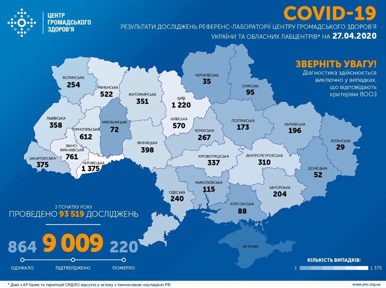 09:15 В Украине 9009 зараженных коронавирусом, зафиксированы 220 летальных случаев. Выздоровели 865 человек. +392 заражений за сутки.