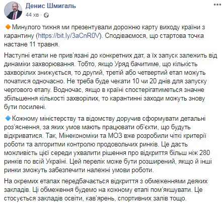 13:10 Кабмин отрабатывает возможность открытия рынков в Украине при соблюдении определенных санитарных норм на время карантина. К среде разработают план и примут новые стандарты работы. Более 280 рынков могут открыться к концу недели.