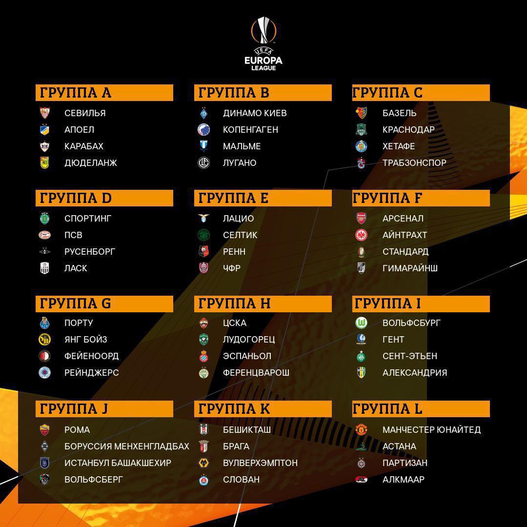 Корзина 1: "Севилья" (Испания), "Арсенал" (Лондон, Англия), "Порту" (Португалия), "Рома" (Италия), "Манчестер Юнайтед" (Англия), "Динамо" (Киев, Украина), "Бешикташ" (Турция), "Базель" (Швейцария), "Спортинг" (Португалия), ЦСКА (Москва, Россия), "Вольфсбург" (Германия), "Лацио" (Италия).