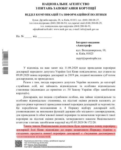 "Апостроф" направил в правоохранительные органы три запроса: в НАЗК (о декларации нардепа), НАБУ (о жомовой яме) и МВД (о "номерах прикрытия" на авто). В ответ НАЗК сообщили, что собираются провести "полную проверку" декларации Кивы и, в случае нарушений, отправить материалы для дальнейшего расследования.